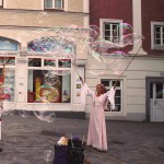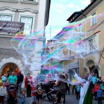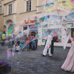 Die Riesenseifenblasen als filigranes Kunstobjekt bewegten sich durch das Publikum und weit darüber hinaus, berühren die <Gäste und Zuseher und erschaffen eine zauberhaft magische Stimmung.